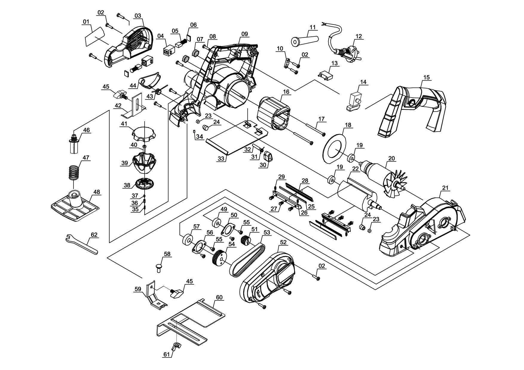 The electric planer PLR-750 is a powerful hand-held planer for jobs with a chip depth of up to two millimeters. With 750 W power and an idle speed of 16.000 rpm, the PLR-750 efficiently tackles wooden surfaces and enables the ambitious DIY enthusiast to perform precise work. For optimum results in one go it has a large knife shaft. The integrated automatic park rest provides safe parking and protects the workpiece against unintended damage. The solid aluminium soleplate helps the user to achieve flat results. The ergonomic handle fits securely in the hand and enables the hand-held planer for working without fatigue even when working on demanding projects. The soft grip also permits safe and user-friendly handling. Included in the delivery are a parallel and a rebate depth guide as well as a carbide planing knife (reversible).